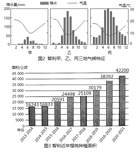 材料三:图1为智利大樱桃种植的主要区域图。图2为智利甲、乙、丙三地气候特征图。图3为智利近年樱桃种植面积图。