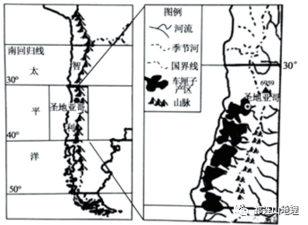 4.中国有句古话“樱桃好吃树难栽”,车厘子( cherry的音译)是产于美洲的大樱桃,夏季成熟,喜光喜温而不耐寒,不抗旱,也不耐涝和盐碱,抵御病虫害的能力较低。适宜生长在土质疏松、土层深厚的沙壤土。智利以盛产质优价廉的车厘子而著名于世。得天独厚的位置和相对封闭的环境,使这里的车厘子很少受到病虫害,尤其是外来病虫害侵袭。下图示意车厘子产区。